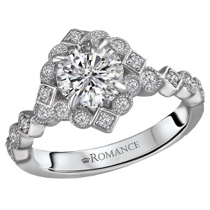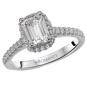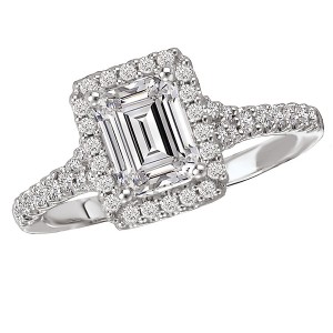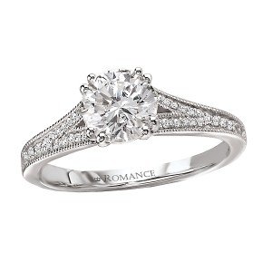 Diamond Ring in 18kt White Gold. (D 1.05 carat total weight) This item is a SEMI-MOUNT and it comes with NO CENTER STONE as shown but it will accommodate a 8.2mm round center stone.