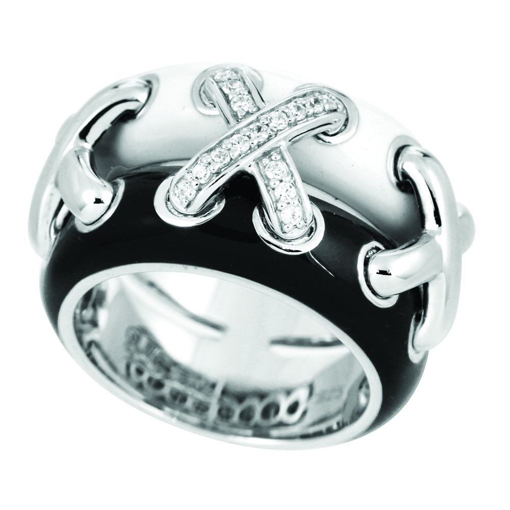 Maille Black Ring by Belle Etoile . Hand-painted black and white Italian enamels with white stones set into rhodium-plated nickel allergy-free 925 sterling silver.