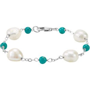 69344 / Bracelet / Set / Sterling Silver / Pearl / Cultured White Freshwater Pearl / Natural Turquoise / 10.0-11.0 Mm / 7 1/2 In / Polished / Cultured White Freshwater Pearl And Natural Turquoise Bracelet