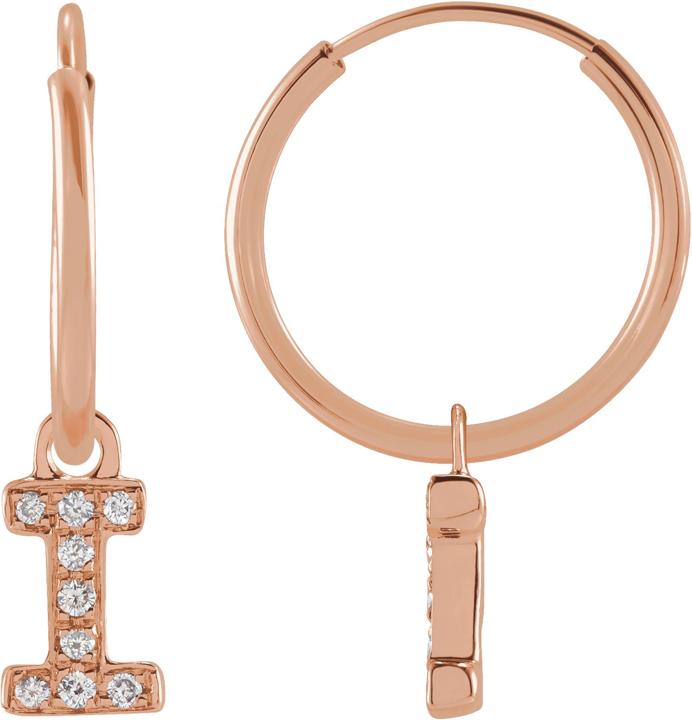 88128 / 14K Rose / Set / Natural Diamond / Round / Each / .85Mm :: 0.03 Ctw / Initial I / I1, H+ / Ear Wire / Hinged / Polished / .03 Ctw Natural Diamond Initial Hoop Earring