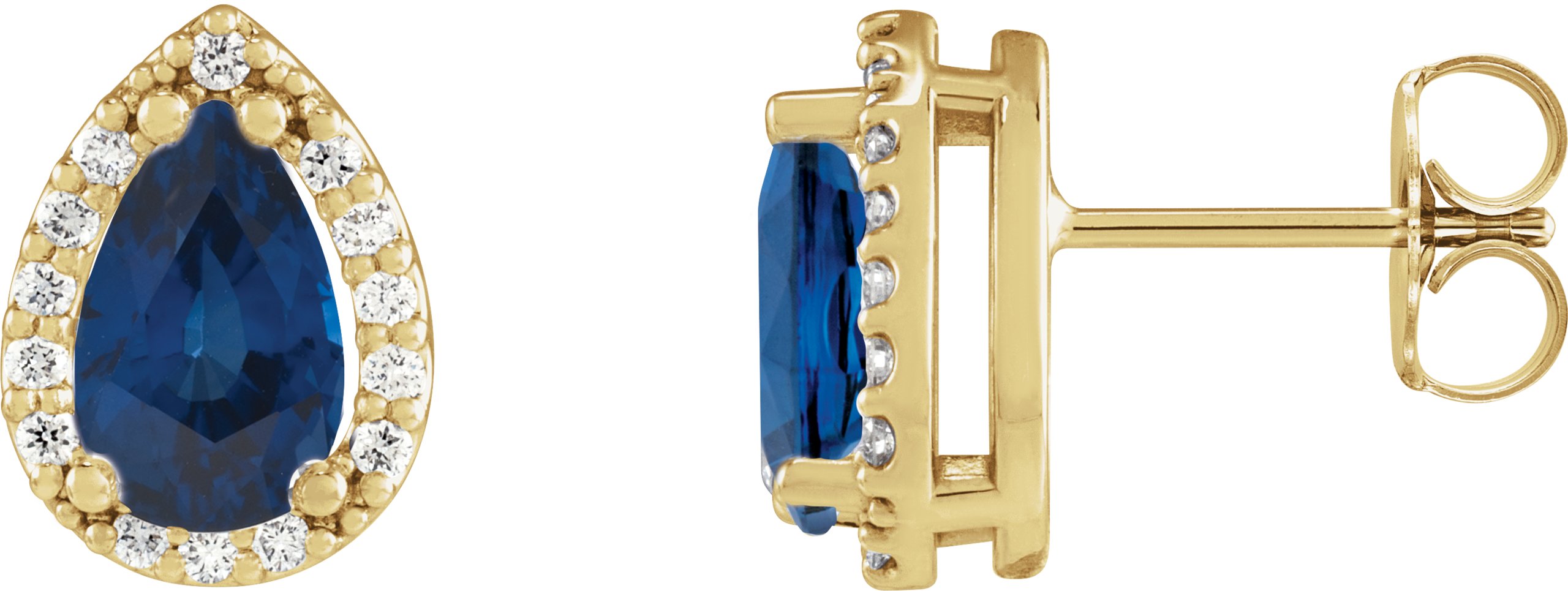 88143 / Earring / Set / Lab-Grown Blue Sapphire / Pear / 6 X 4 Mm / 14K Yellow / Natural Diamond / Pair / Friction Backs Included / Polished / Lab-Grown Blue Sapphire And 1/10 Ctw Natural Diamond Halo-Style Basket Earrings