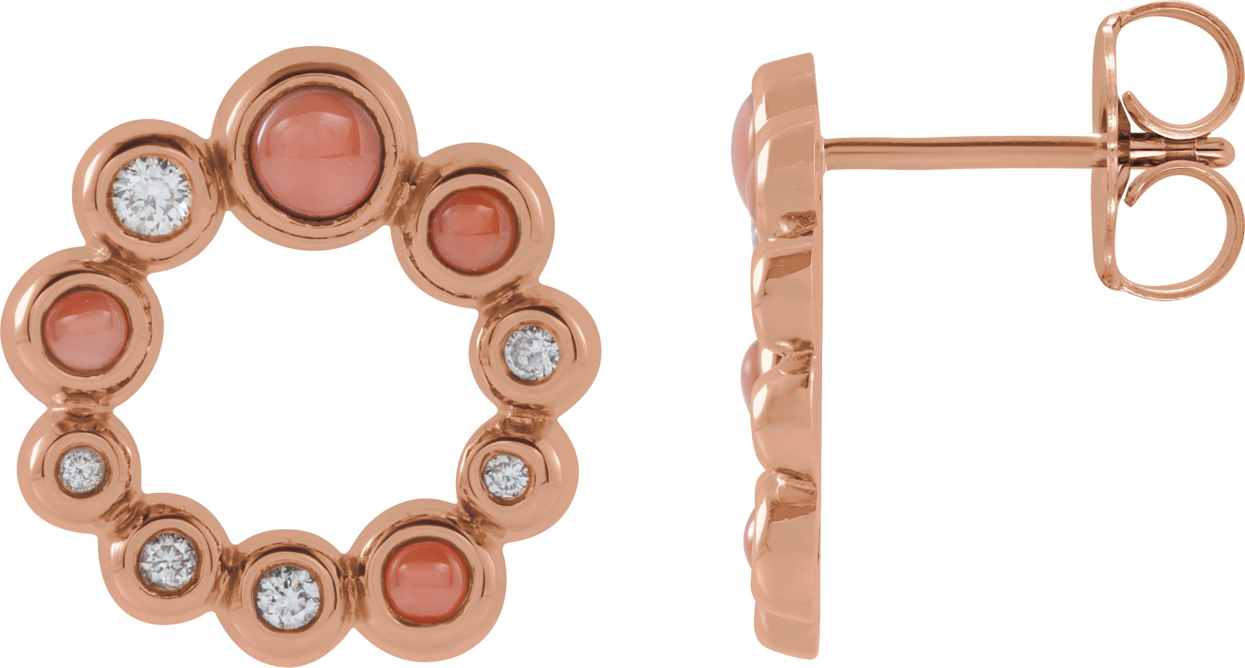 87180 / Earring / Set / Pink Coral / Round / 3 Mm / 14K Rose / Pair / Friction Backs Included / Polished / Pink Coral And 1/8 Ctw Diamond Earrings