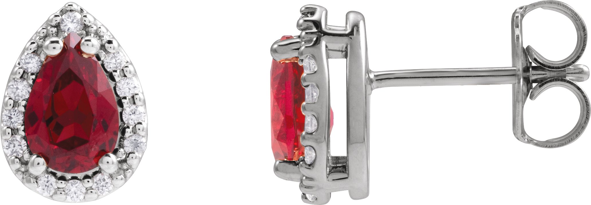 88143 / Earring / Set / Lab-Grown Ruby / Pear / 6 X 4 Mm / 14K White / Natural Diamond / Pair / Friction Backs Included / Polished / Lab-Grown Ruby And 1/10 Ctw Natural Diamond Halo-Style Basket Earrings