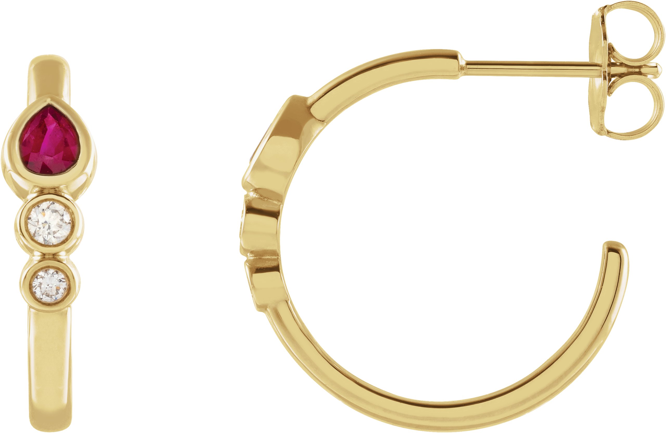 87343 / Earring / Set / Natural Ruby / Pear / 4 X 3 Mm / 14K Yellow / Natural Diamond / Pair / Friction Backs Included / Polished / Natural Ruby And 1/10 Ctw Natural Diamond Bezel-Set Hoop Earrings