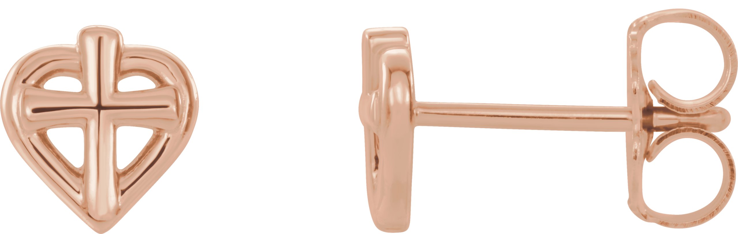 R17022 / 14K Rose / Pair / Friction / Friction Backs Included / Polished / Cross With Heart Youth Earrings