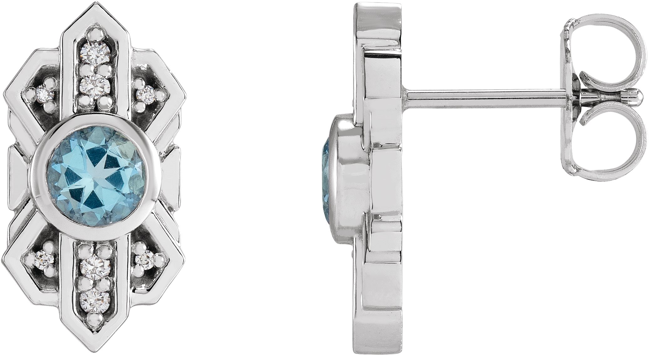 87467 / Earring / Set / Natural Aquamarine / Round / 4 Mm / 14K White / Pair / Friction Backs Included / Polished / Aquamarine And .07 Ctw Natural Diamond Art Deco Earrings