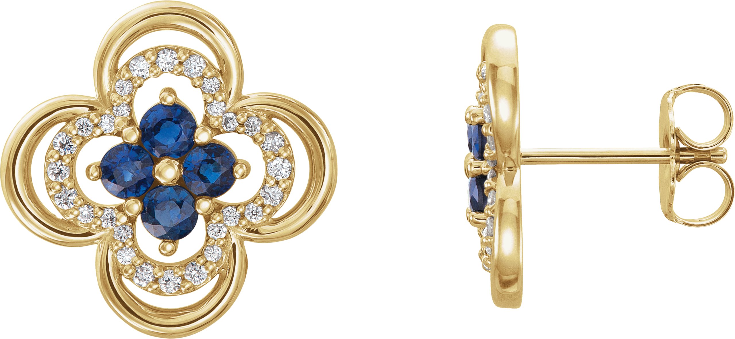 86370 / Set / 14K Yellow / Blue Sapphire / Pair / Polished / Genuine Blue Sapphire And 1/5Ctw Diamond Clover Earrings With Backs