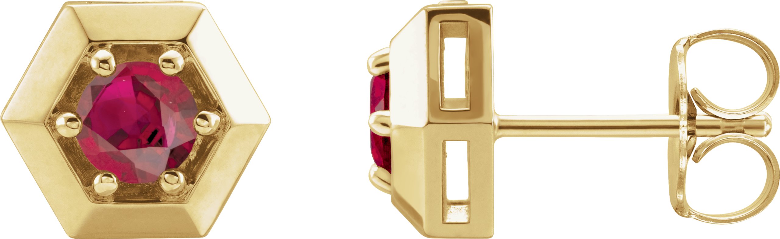 87127 / 14K Yellow / Set / Round / Chatham Lab-Created Ruby / Pair / Friction Post / Friction Backs Included / 6-Prong / Polished / Solitaire Hexagon Stud Earrings