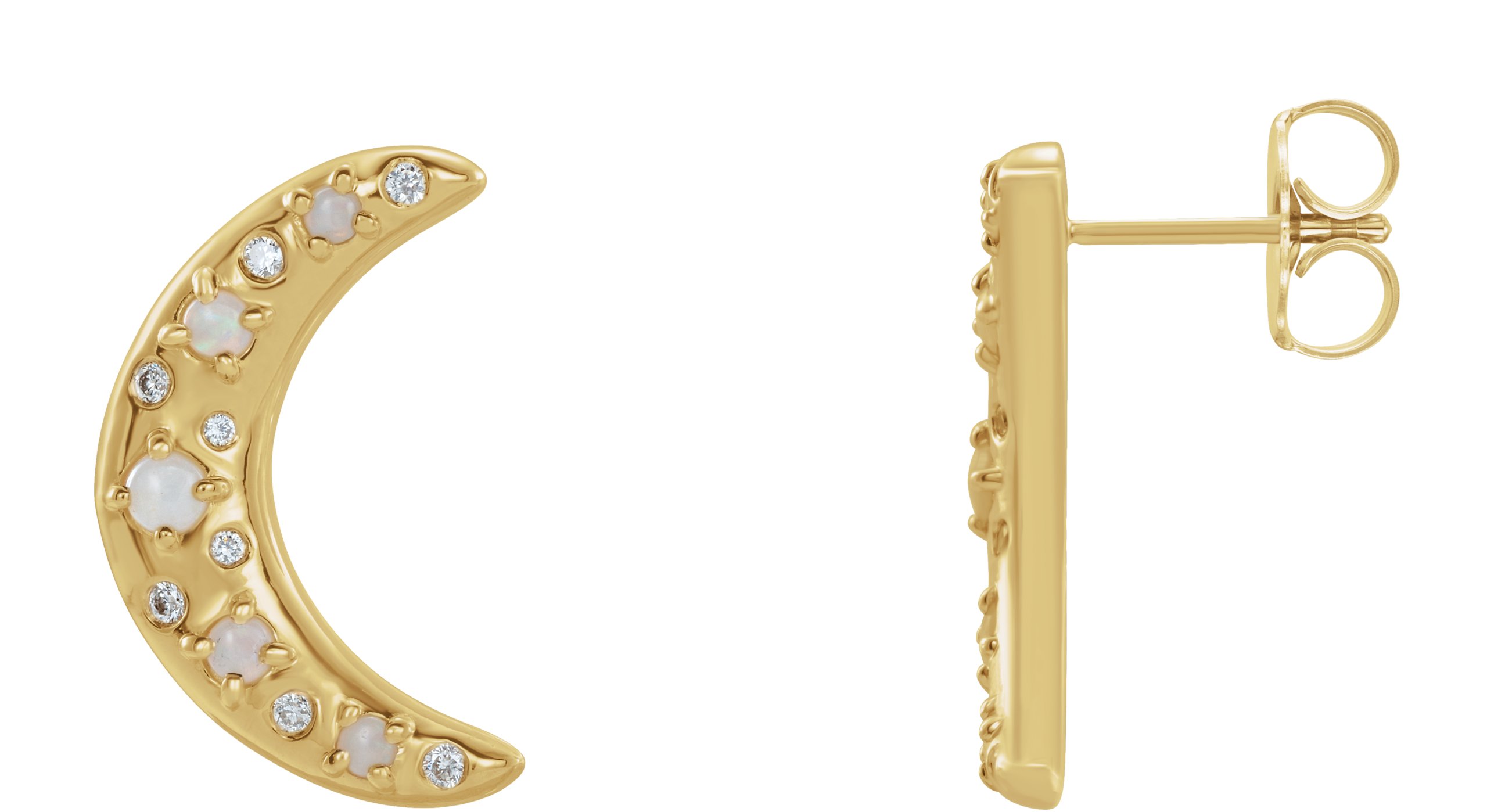 87215 / Earring / Set / Natural White Opal / Round / 14K Yellow / Natural Diamond / Pair / Friction Backs Included / Polished / Natural White Opal And 1/8 Ctw Natural Diamond Cabochon Crescent Moon Earrings