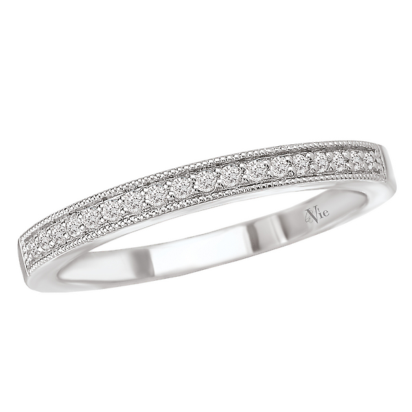 This is a matching diamond wedding band created in 14kt white gold with milgrain detail. (D 1/10 carat total weight)