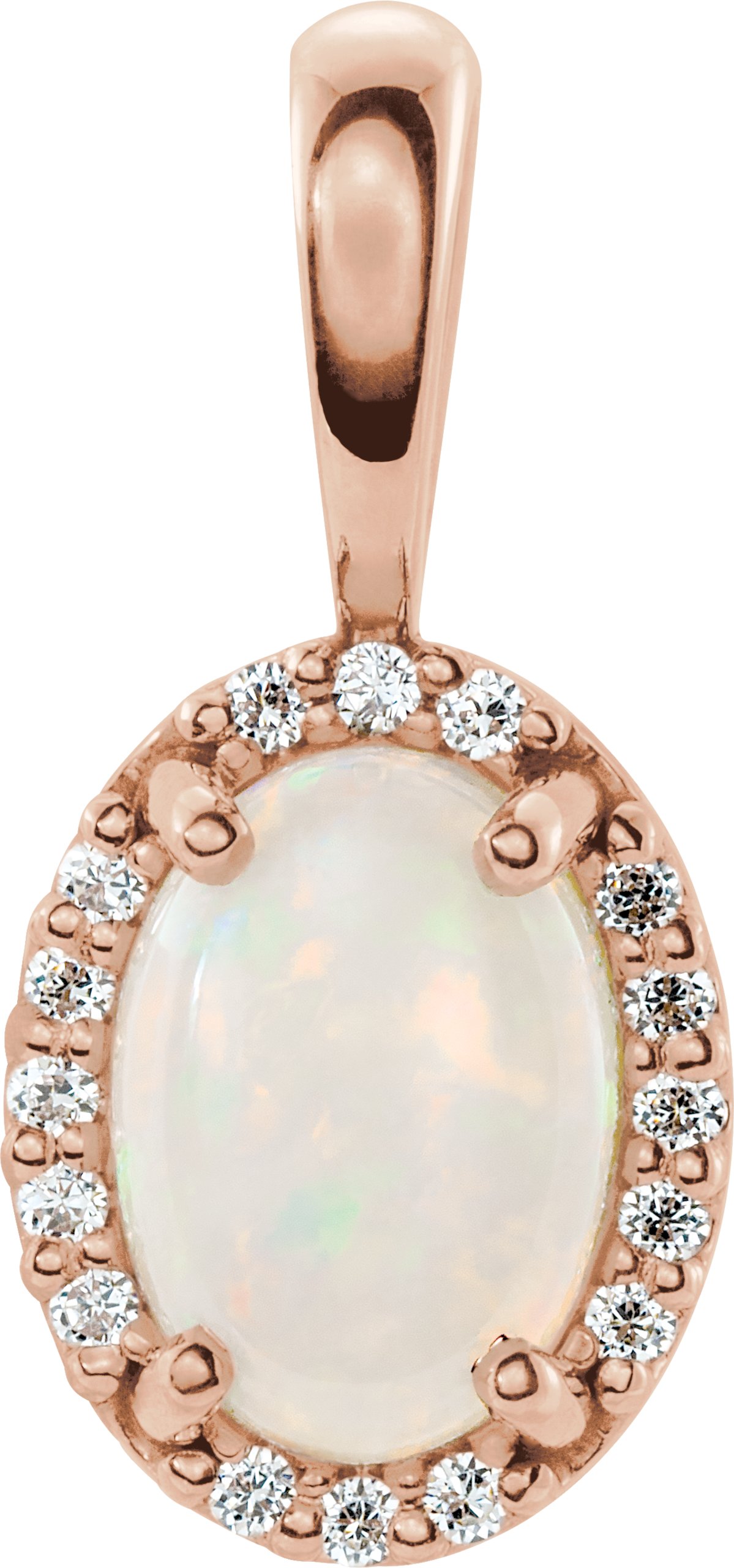29838 / Pendant / Set / 14K Rose / Oval / Natural White Opal / 6 X 4Mm :: 0.04 Ctw / Natural Diamond / I1, G-H / Polished / Natural Opal And .04 Ctw Natural Diamond Halo-Style Pendant