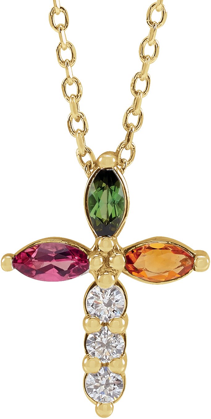 R42415 / Necklace / Set / 14K Yellow / Marquise / Multi-Gemstone / 4 X 2Mm :: 1/10 Ctw / I1, G-H / 16-18 In / Polished / "Natural Pink Tourmaline, Natural Green Tourmaline, Natural Citrine And 1/10 Ctw Natural Diamond Cross Necklace"