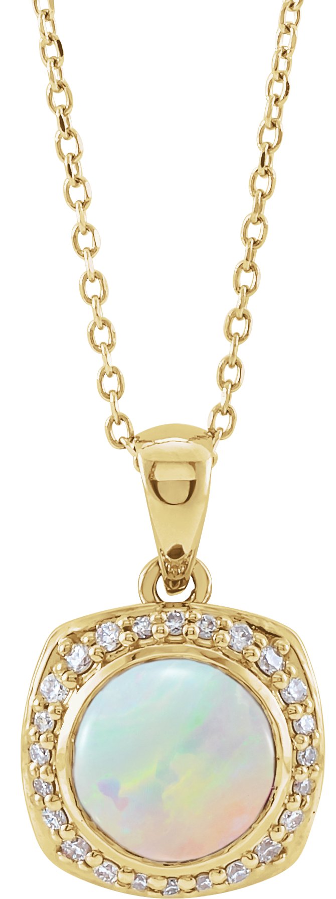 87422 / Set / Natural White Ethiopian Opal / Round / Necklace / 14K Yellow / I1, G-H :: 1/8 Ctw / 19.84 X 12.22 Mm / 16-18 In / Polished / Natural White Ethiopian Opal And 1/8 Ctw Natural Diamond Halo-Style Cabochon Necklace