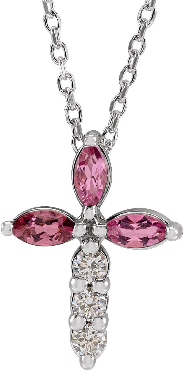 R42415 / Necklace / Set / Sterling Silver / Marquise / Natural Pink Tourmaline / 4 X 2Mm :: 1/10 Ctw / I1, G-H / 16-18 In / Polished / Natural Pink Tourmaline And 1/10 Ctw Natural Diamond Cross Necklace