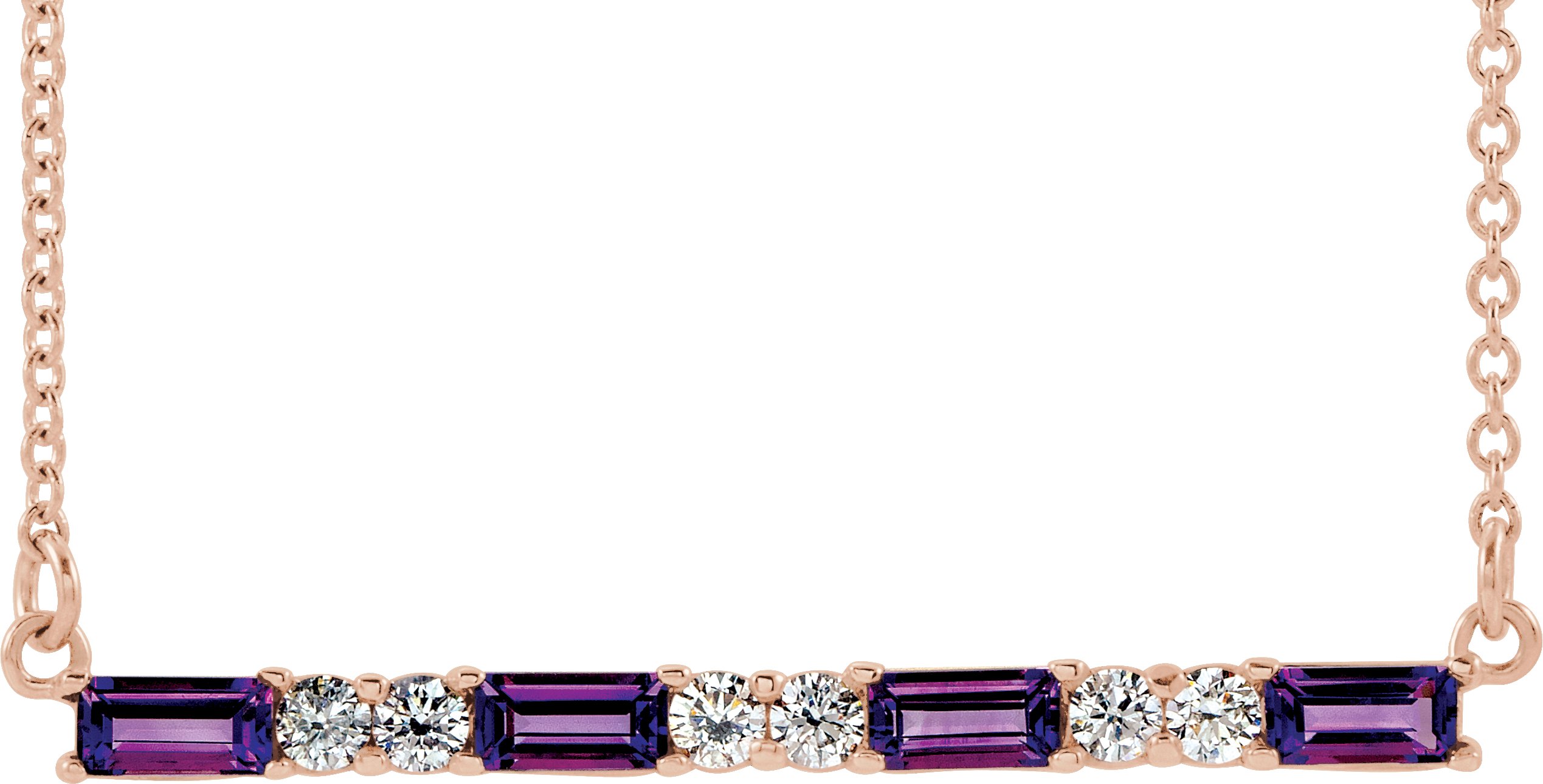 86790 / Necklace / Set / 14K Rose / Straight Baguette / Natural Amethyst / 4 X 2Mm :: 1/5 Ctw / I1, G-H / 16-18 In / Polished / Natural Amethyst And 1/5 Ctw Natural Diamond Bar Necklace