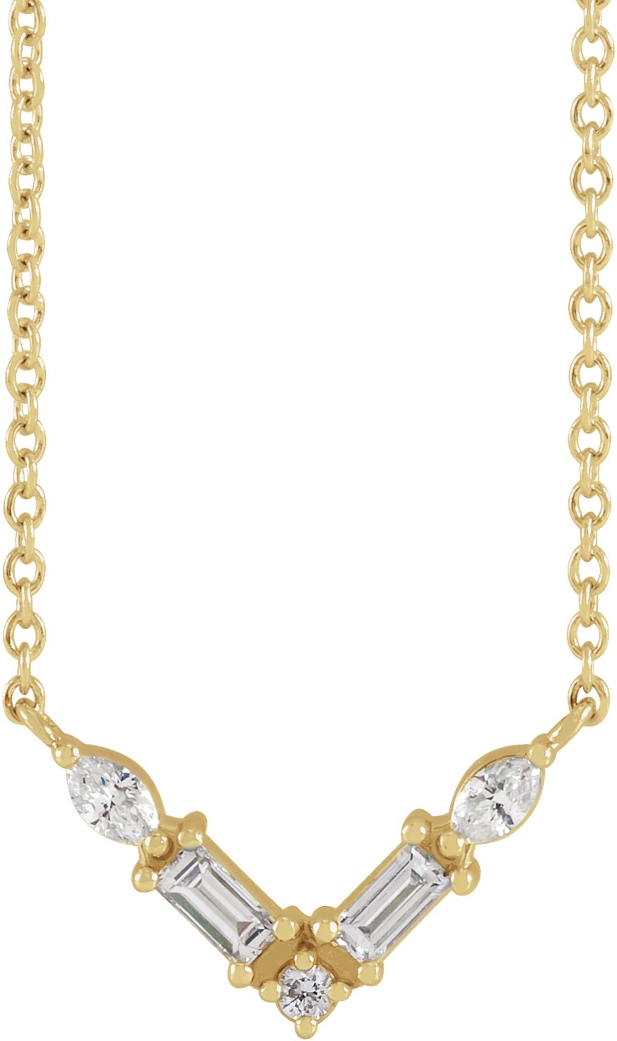 87509 / Necklace / Set / 14K Yellow / Straight Baguette / Natural Diamond / 3.25 X 1.5Mm :: 1/6 Ctw / Natural Diamond / Si2-Si3, Ghi / 18 In / Polished / 1/6 Ctw Natural Diamond Multi-Shape Petite "V" Necklace