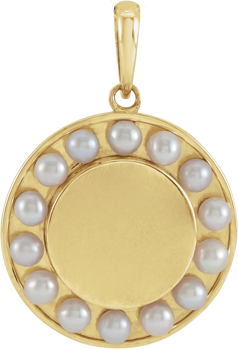 87527 / Pendant / Set / 14K Yellow / Pearl / Cultured White Seed Pearl / 2 Mm / Polished / Halo-Style Cultured White Seed Pearl Engravable Medallion Pendant