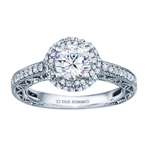 An elegant design this diamond engagement ring showcases a prong-set diamond halo that crowns the center stone within a vintage styled design. This style accommodates various center stone sizes & shapes. Available in Platinum as well as 18K and 14K White Yellow or Rose Gold. Priced as shown .58cts 14K White Gold