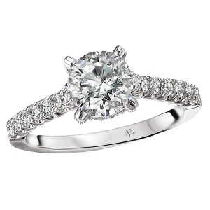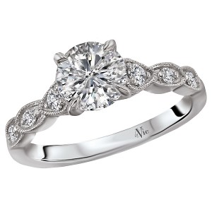 Halo diamond ring in 14kt white gold with filigree and milgrain detail. (D. 1/4 carat total weight) This item is a SEMI-MOUNT and it comes with NO CENTER STONE as shown but it will accommodate a 5.2mm round center stone.