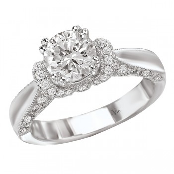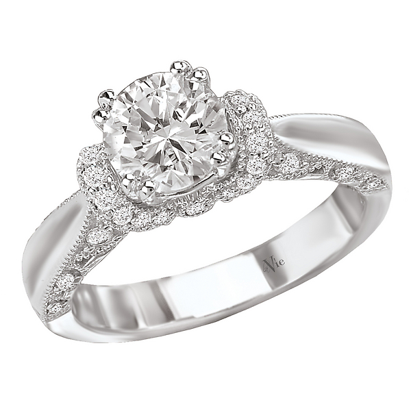 This trellis style peg head engagement ring features round faceted diamonds outlined with milgrain detail created in 14k white gold. (D 1/5 carat total weight) This peg head SEMI-MOUNT ring comes with NO CENTER STONE as shown but it will accommodate a 6.5mm round center.