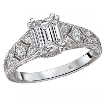 Vintage Style Diamond Ring in 14kt White Gold with Engraving and Milgrain Detail. (D 1/5 carat total weight) This item is a SEMI-MOUNT and it comes with NO CENTER STONE as shown but it will accommodate a 7x5mm emerald center stone.
