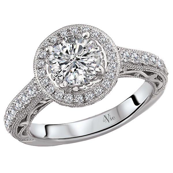 Round Halo Diamond Ring in 14kt White Gold with Milgrain and Filigree. (D 1/2 carat total weight) This item is a SEMI-MOUNT and it comes with NO CENTER STONE as shown but it will accommodate a 6.5mm round center stone.