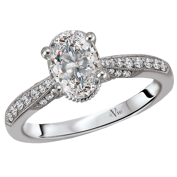 Bridal ring showcases tapered sparkling round diamonds set in high polished 14kt white gold accented with milgrain detail. (D 1/7 carat total weight) This ring is a SEMI-MOUNT and it comes with NO CENTER STONE as shown but it will accommodate a 7x5mm round center stone.