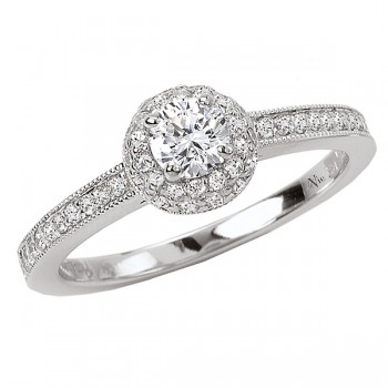 Round Halo Diamond Ring in 14kt White Gold with Milgrain Detail. (D 1/3 carat total weight) This item is a SEMI-MOUNT and it comes with NO CENTER STONE as shown but it will accommodate a 4.0mm round center stone.