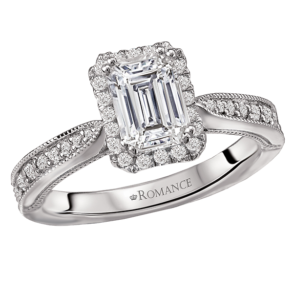 Halo Diamond Ring with Milgrain Detail in 18kt White Gold (D.1/3 carat total weight) This item is a SEMI-MOUNT and it comes with NO CENTER STONE as shown but it will accommodate a 7x5mm emerald cut center stone). This Ring requires a Curved Matching Band, #117221-W, sold separately.