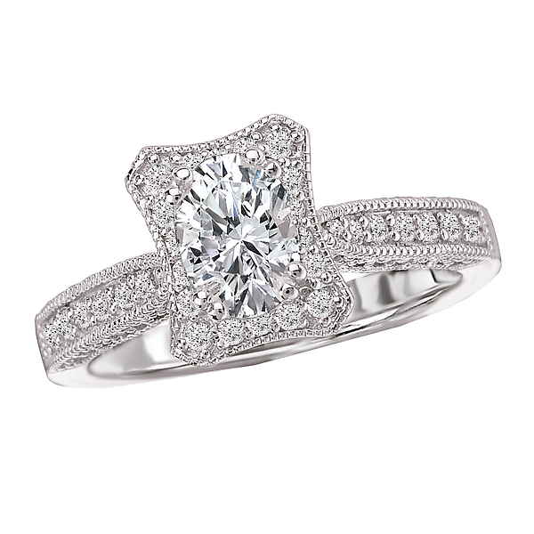 Diamond Ring in 18kt White Gold with a Concave Halo. (D. 1/3 carat total weight) This item is a SEMI-MOUNT and it comes with NO CENTER STONE as shown but it will accommodate a 7x5mm oval cut center stone.