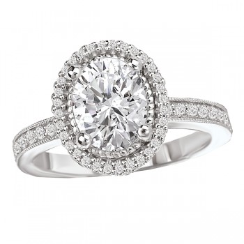 Oval Shaped Halo Diamond Ring with Milgrain Detail in 18kt White Gold. (D 1/4 carat total weight) This item is a SEMI-MOUNT and it comes with NO CENTER STONE as shown but it will accommodate a 8x6mm oval cut center stone.