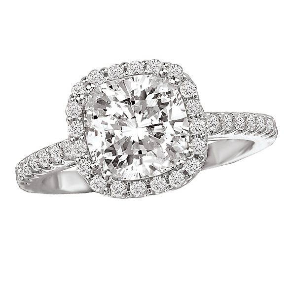 Cushion Style Halo Diamond Ring in 18kt White Gold. (D 1/3 carat total weight) This item is a SEMI-MOUNT and it comes with NO CENTER STONE as shown but it will accommodate a 7.5mm cushion cut center stone.