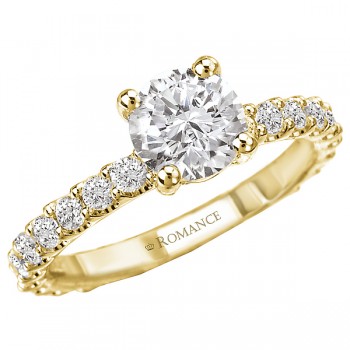 Diamond Romance Engagement Ring in 18kt Yellow Gold. (D 3/4 carat total weight). This item is a SEMI-MOUNT and it comes with NO CENTER STONE as shown but it will accommodate a 6.5mm round center stone.
