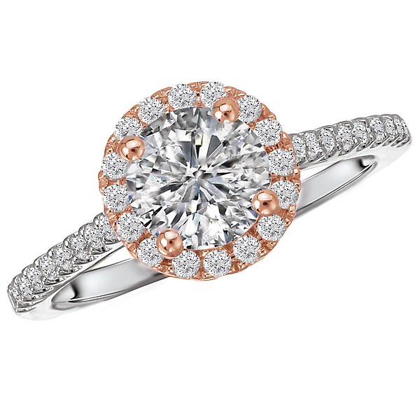 Semi-Mount Round Halo Diamond Engagement Ring in 18kt White and Rose Gold. (D. 1/4 carat total weight). This item is a SEMI-MOUNT and it comes with NO CENTER STONE as shown but it will accommodate a 6.5mm round center stone.