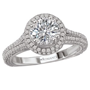 Pinched Bar Design Round Halo Diamond Ring in 18kt White Gold. (D 3/8 carat total weight). This item is a SEMI-MOUNT and it comes with NO CENTER STONE as shown but it will accommodate a 6.5mm round center stone.