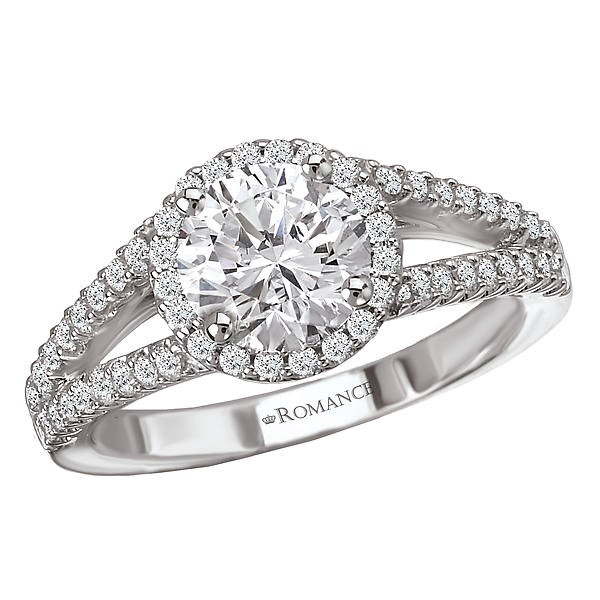 Split Shank Round Halo Diamond Ring in 18kt White Gold. (D1/3 carat total weight). This item is a SEMI-MOUNT and it comes with NO CENTER STONE as shown but it will accommodate a 6.5mm round center stone.