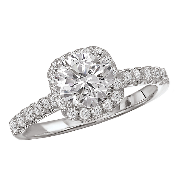 Cushion Style Halo Diamond Romance Engagement Ring in 18kt White Gold. (D. 1/3 carat total weight) This item is a SEMI-MOUNT and it comes with NO CENTER STONE as shown but it will accommodate a 6mm round center stone.