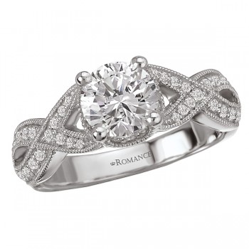Braided Style Diamond Ring in 18kt White Gold with Milgrain Detail. (D1/4 carat total weight) This item is a SEMI-MOUNT and it comes with NO CENTER STONE as shown but it will accommodate a 6.5mm round center stone.