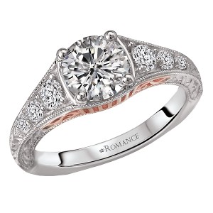 Engagement Diamond RIng in 18kt White and Rose Gold with Etching and Heart Designs. (D.1/5 carat total weight). This item is a SEMI-MOUNT and it comes with NO CENTER STONE as shown but it will accommodate a 6.5mm round center stone.
