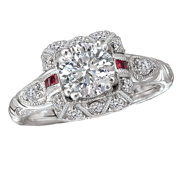 Halo Diamond and Ruby Ring in 18kt White Gold with Milgrain and Engraved Design. (D 1/4 carat weight and R 1/8 gem weight) This item is a SEMI-MOUNT and it comes with NO CENTER STONE as shown but it will accommodate a 6.5mm round center stone.