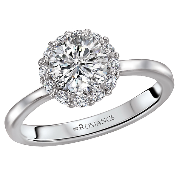 Round Halo Diamond Ring in 18kt White Gold. (D 1/3 carat total weight). This item is a SEMI-MOUNT and it comes with NO CENTER STONE as shown but it will accommodate a 6.5mm round center stone.
