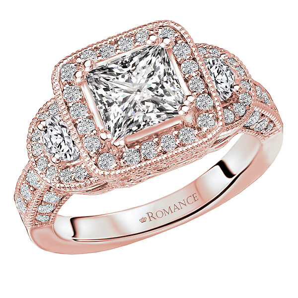 Princess Style Halo Diamond Ring with Milgrain Detail in 18kt Rose Gold (D.1.0 carat total weight). This item is a SEMI-MOUNT and it comes with NO CENTER STONE as shown but it will accommodate a 5-5.5mm princess cut center stone