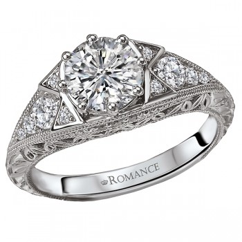 Vintage Style Diamond Ring in 18kt White Gold with Engraving and Milgrain Detail. (D 1/3 carat total weight) This item is a SEMI-MOUNT and it comes with NO CENTER STONE as shown but it will accommodate a 6.5mm round center stone.