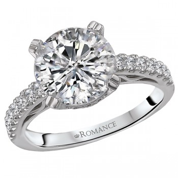 Diamond Ring in 18kt White Gold with Cut Out Detail. (D 1/2 carat total weight) This item is a SEMI-MOUNT and it comes with NO CENTER STONE as shown but it will accommodate a 9.3mm round center stone.