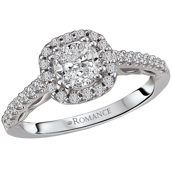 Cushion Shaped Halo Diamond Ring in 18kt White Gold. (D 1/3 carat total weight) This item is a SEMI-MOUNT and it comes with NO CENTER STONE as shown but it will accommodate a 5mm cushion center stone.