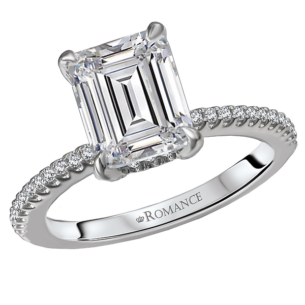 This Elegant Ring Features Round Diamonds along the side and a Claw Prong Peg Head Center. (D 1/3 carat total weight) This item is a SEMI-MOUNT and it comes with NO CENTER STONE as shown but it will accommodate a 8.5x6.5mm emerald cut center stone.