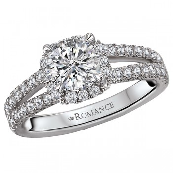 This split shank ring features a sparkling halo of round faceted diamonds set in high polished 18kt White Gold. (D 1/2 carat total weight) This item is a SEMI-MOUNT and it comes with NO CENTER STONE as shown but it will accommodate a 6.5mm round center stone.