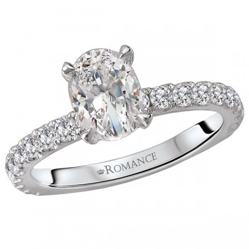 This Elegant Ring features Round Diamonds along the side all set in High Polished 18k White Gold and a Fancy Peg Head Setting in the Center (D 5/8 Carat total weight) This ring is a SEMI-MOUNT and it comes with NO CENTER STONE as shown but it will accommodate a 7x5mm oval center stone.
