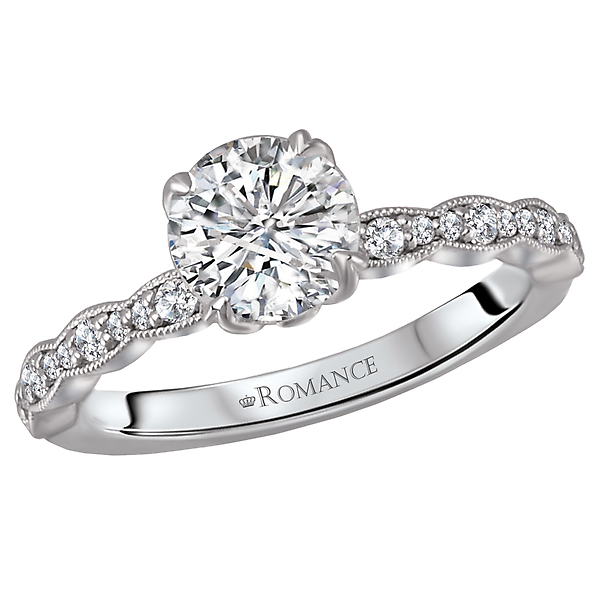This elegant ring features a scalloped shank lined with milgrain and sparkling round diamonds surrounding the fancy peg head setting created in high polished 18k white gold. (D 1/6 carat total weight) This ring is a SEMI-MOUNT and it comes with NO CENTER STONE as shown but it will accommodate a 6.5mm round center stone.