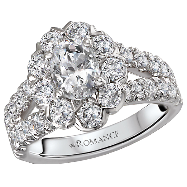 This designer inspired split shank ring showcases an oval shaped halo with round sparkling diamonds set in high polished 18kt white gold. (D 1 1/3 carat total weight) This ring is a SEMI-MOUNT and it comes with NO CENTER STONE as shown but it will accommodate a 7X5mm oval center stone.